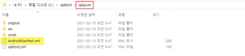 다시 해당 폴더를 열면 apk파일이 디컴파일 된 것을 확인할 수 있습니다.