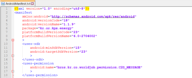 Notepad로 xml파일을 열면 앱의 패키지명, 버전 등의 정보를 확인할 수 있으며, 그 외에 퍼미션정보 역시 확인할 수 있는 것을 알 수 있습니다.