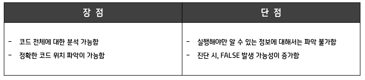 실제 실행 없이 코드나 리소스를 가지고 분석을 진행하는 방법을 의미한다.